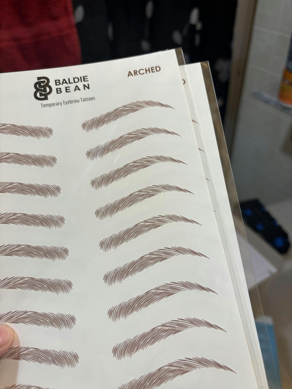 I really wanted to like these. I got some from another company before trying these, and the others are so much better. I'm going through chemo and have lost all of my brows. Every hair, so they did go on okay. I saw these ads and loved the concept of this company and was excited to support it, but they just don't work. They went on well and lasted the day IF I didn't touch them. If I sweat or got my face wet at all it was 50/50 if they would stay on or get kind of blotchy looking, or just completely come off. If you TOUCH them when you sweat, or swim they're for sure getting really blotchy. The other brand is honestly the same way so that wasn't the deal breaker. The 1 star review comes from the shape and color. The shape was awful, and looked nothing like the pictures. I got the arched look and the "base" (by your nose) is almost completely straight until the little arch. It looks really weird. The hair strokes also don't blend at all where it arches so it looks really fake. You can see the comparison in the photo. Top pic is Baldie Bean, bottom is another brand. I ordered the same (arched and brown) from both companies. You can see how straight they are in comparison, and the red undertones. Sad these didn't work out, and sad I wasted more money.